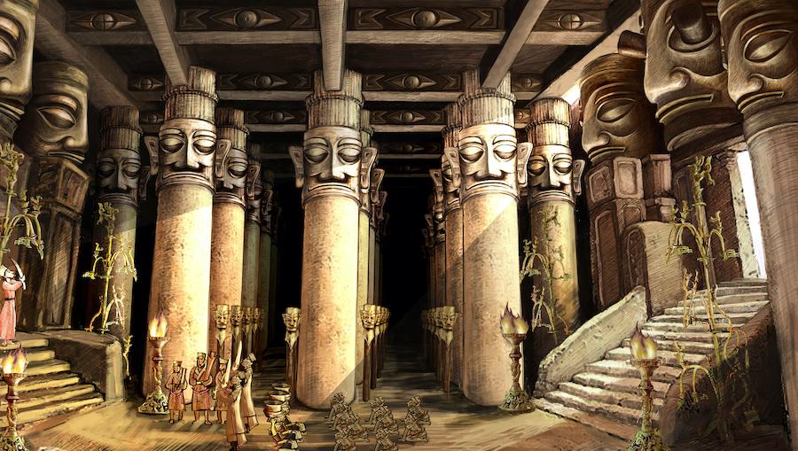 三星堆神廟復(fù)原圖,兩個祭祀坑中的出土文物,過去可能都是懸掛在宗廟中的。 金磊磊繪、廣西師范大學(xué)出版社 圖