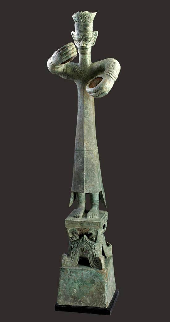 三星堆遺址出土銅喇叭座頂尊跪坐人像。 廣西師范大學(xué)出版社 圖