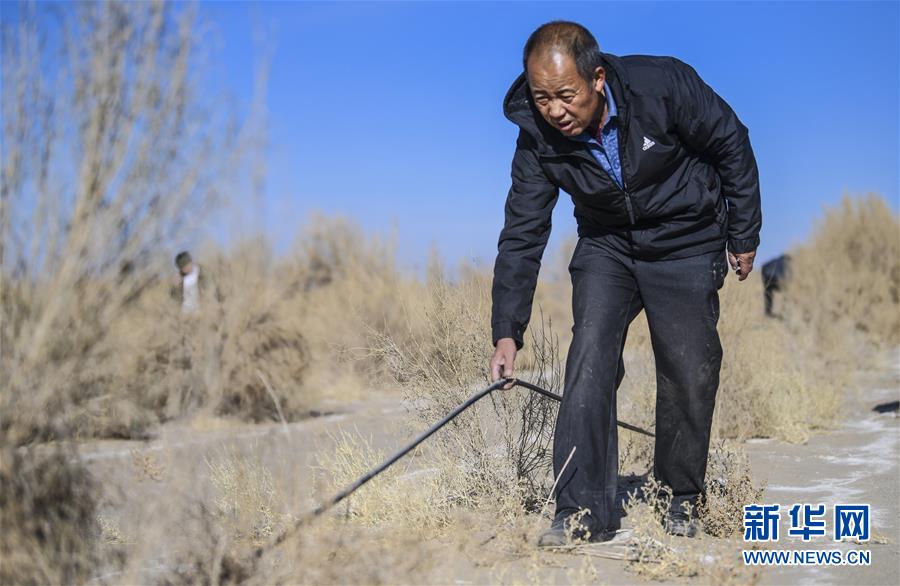 新疆且末縣防風(fēng)治沙站副站長(zhǎng)佟戈雁在治沙現(xiàn)場(chǎng)查看滴灌管道的維護(hù)情況(11月15日攝)。新華社記者 王菲 攝