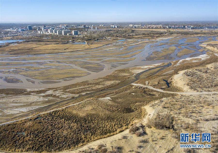 從空中俯瞰位于新疆且末縣境內(nèi)的車爾臣河,以及河?xùn)|的防沙治沙綠色長(zhǎng)廊與河西的縣城樓宇(11月15日無人機(jī)拍攝)。新華社記者王菲 攝