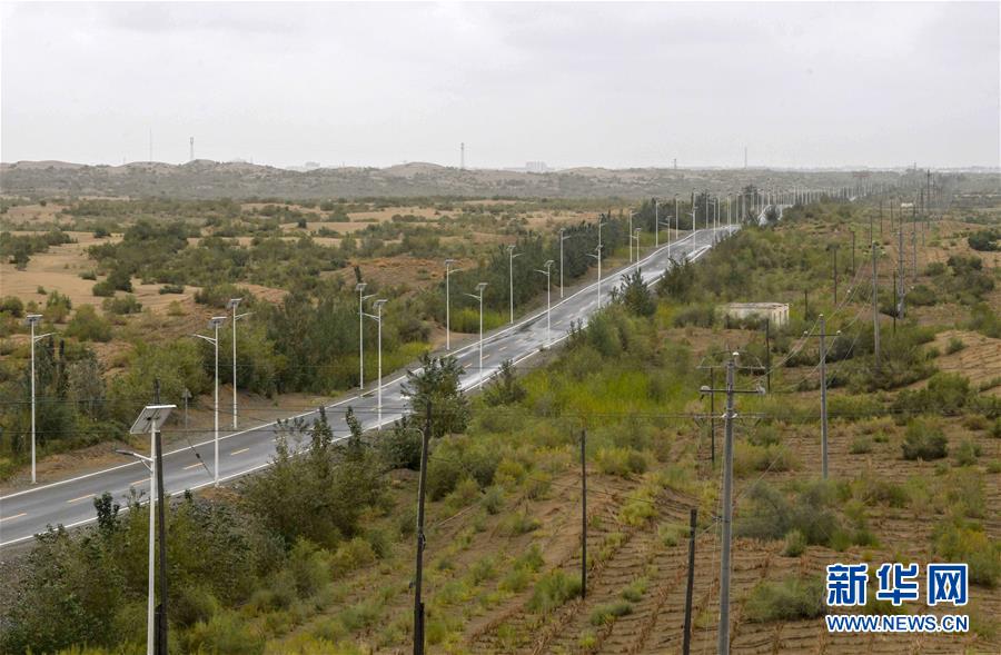 在新疆且末縣車爾臣河以東的防沙治沙綠色長(zhǎng)廊,一條柏油路從沙漠中延伸,道路兩側(cè)綠意盎然(8月21日攝)。新華社記者 趙戈攝