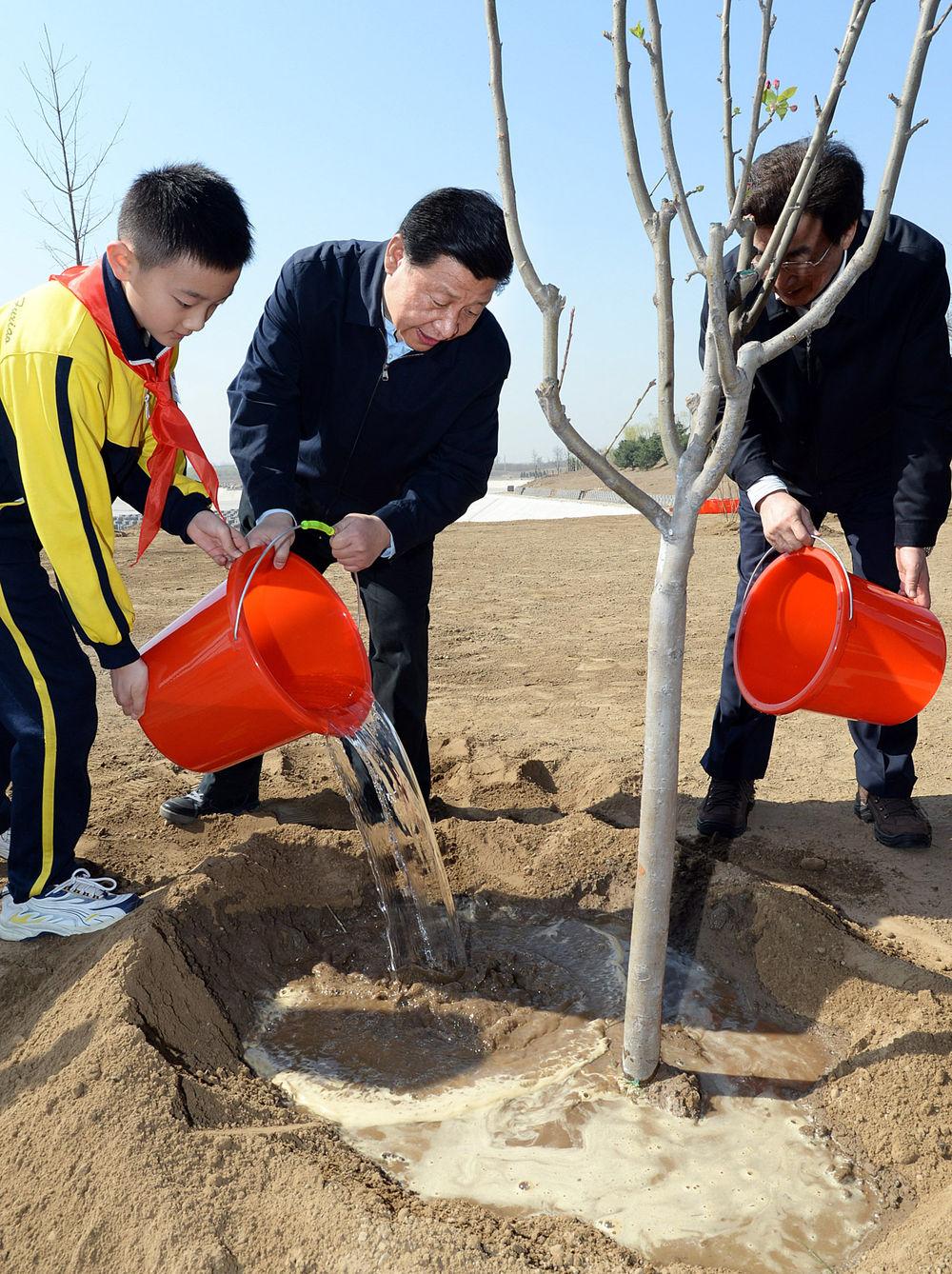 ↑2014年4月4日,黨和來到北京市海淀區(qū)南水北調(diào)團(tuán)城湖調(diào)節(jié)池參加首都義務(wù)植樹活動(dòng)。這是同大家一起給剛栽下的樹苗澆水。植樹結(jié)束時(shí),向工程負(fù)責(zé)人了解了南水北調(diào)水源的水質(zhì)與保護(hù)和調(diào)節(jié)池施工進(jìn)展情況。