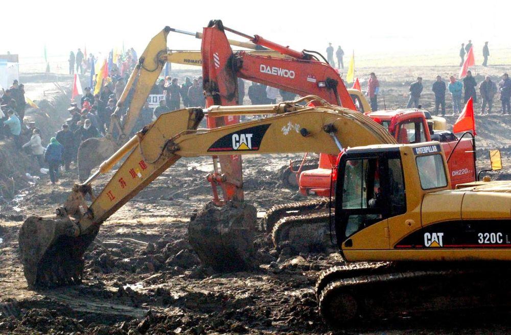 ↑2002年12月27日在江蘇揚(yáng)州寶應(yīng)縣南水北調(diào)東線工程潼河工地拍攝的施工現(xiàn)場(chǎng)。南水北調(diào)工程在這一天正式開工建設(shè)。