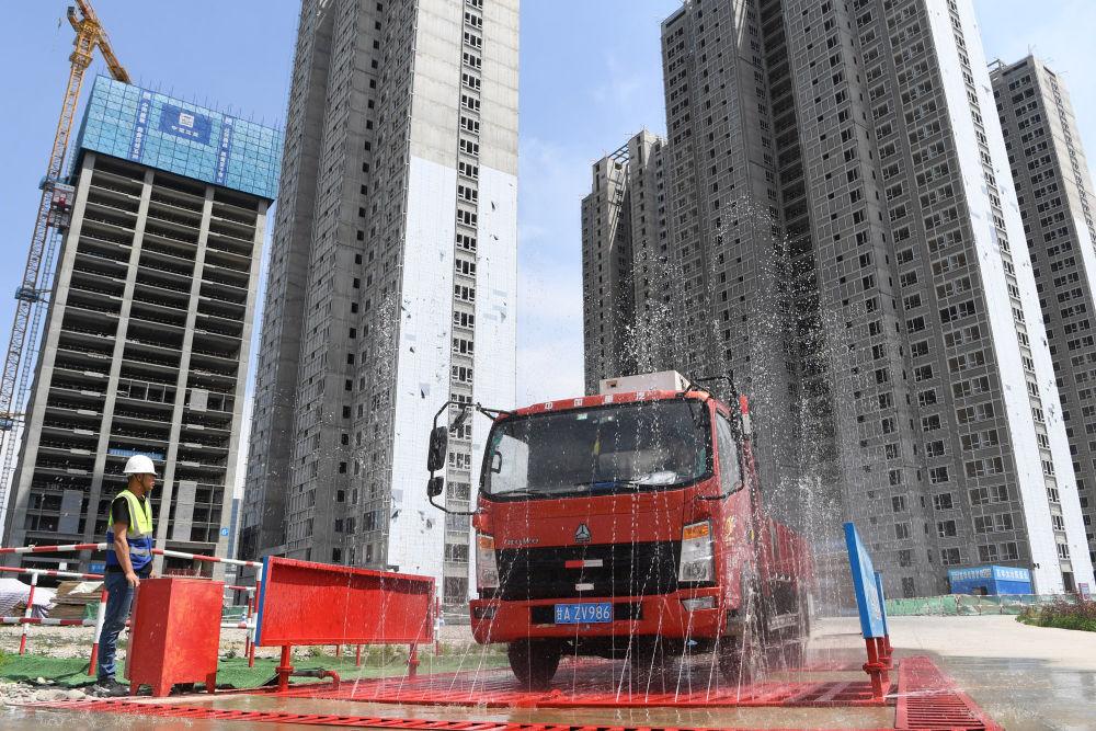 ↑在甘肅省蘭州市中建三局一處建設(shè)工地上,感應(yīng)式的洗車臺(tái)利用循環(huán)再生水沖洗車輛,并對(duì)污水再次回收利用(5月12日攝)。