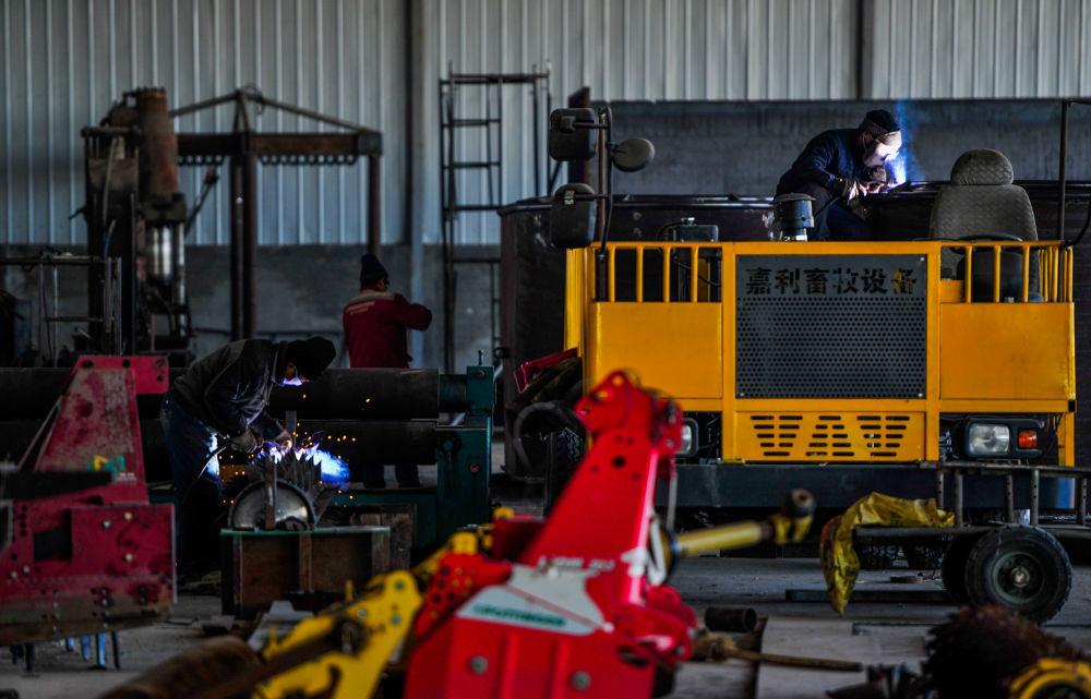 ↑2020年3月10日,工人在內(nèi)蒙古嘉利節(jié)水灌溉有限公司廠房?jī)?nèi)加工零件。