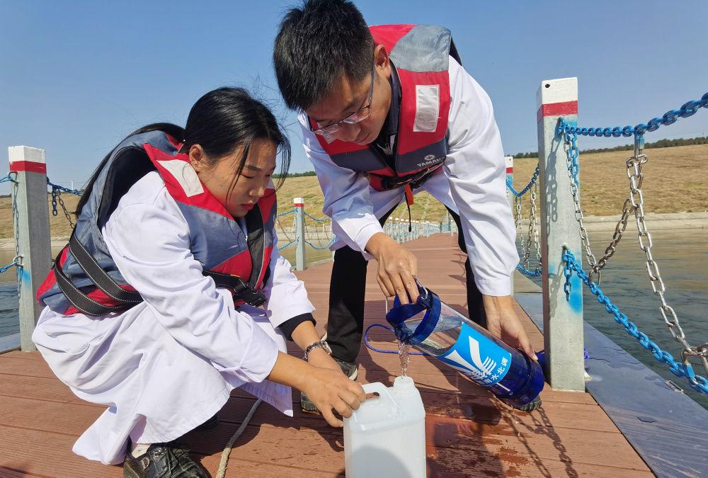 ↑2020年11月12日,工作人員在南水北調(diào)中線陶岔渠首監(jiān)測(cè)水質(zhì)。