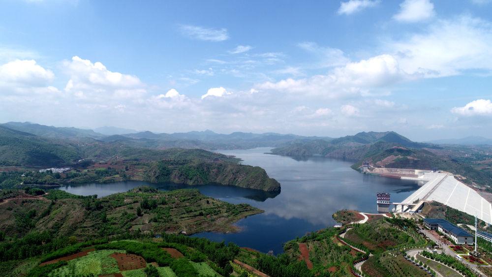 ↑位于河南省汝陽(yáng)縣前坪村的前坪水庫(kù),是一座以防洪為主,兼具供水、灌溉、發(fā)電功能的大型水利樞紐工程,是國(guó)務(wù)院確立的172項(xiàng)節(jié)水供水重大水利工程之一(無人機(jī)照片,4月26日攝)。