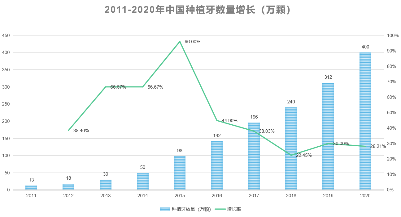 據(jù)中泰證券研報顯示,2020年我國種植量約400萬顆,換句話說,中國每萬人種植牙數(shù)達(dá)到了28顆。而在此前的10年間,中國種植牙數(shù)量復(fù)合增速達(dá)到了驚人的46%。