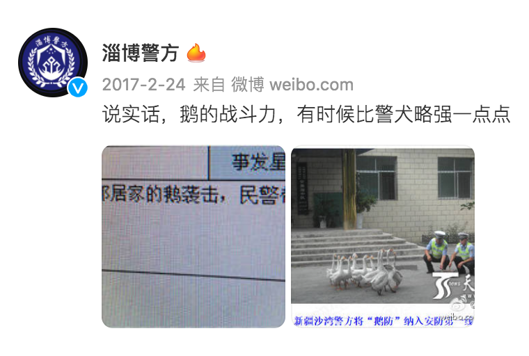 早在2013年,新疆沙灣警方就養(yǎng)鵝維穩(wěn),稱鵝比狗好使;淄博警方也曾發(fā)微博側(cè)面印證了這一說法——“說實(shí)話,鵝的戰(zhàn)斗力有時(shí)候比警犬略強(qiáng)一點(diǎn)點(diǎn)?!?/strong>