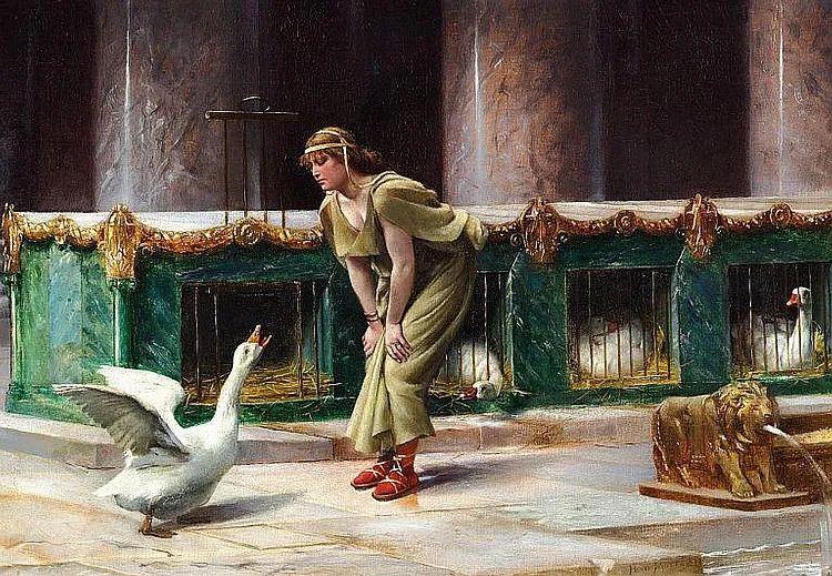 公元前390年,羅馬城被高盧人攻占,阿利亞戰(zhàn)役的失敗造成羅馬歷史上的大恥辱。羅馬軍民逃到險(xiǎn)峻的卡庇托林山頂盤踞防守,高盧人久攻不下便采取了圍困的方式。兵不厭詐,有一天高盧人決定夜晚突襲,當(dāng)天值班的羅馬衛(wèi)隊(duì)睡著了,即使羅馬人的犬類們也未聽到敵人來襲,是羅馬士兵散養(yǎng)的一群大鵝受驚大叫,羅馬士兵才被驚醒,發(fā)現(xiàn)敵人偷襲,趕忙起身作戰(zhàn)擊退了高盧人。羅馬人一直覺得鵝救了羅馬城。