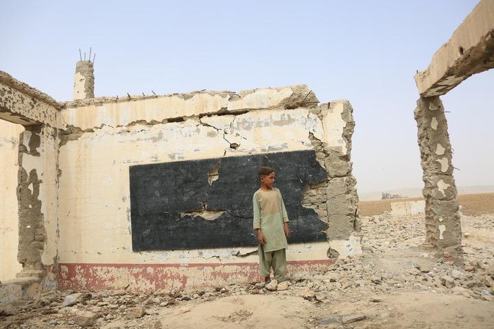 2022年8月23日,在曾多次遭到美軍空襲的阿富汗南部赫爾曼德省桑金地區(qū),一名男孩站在廢墟之中。新華社發(fā)(塞夫拉赫曼·薩菲攝)