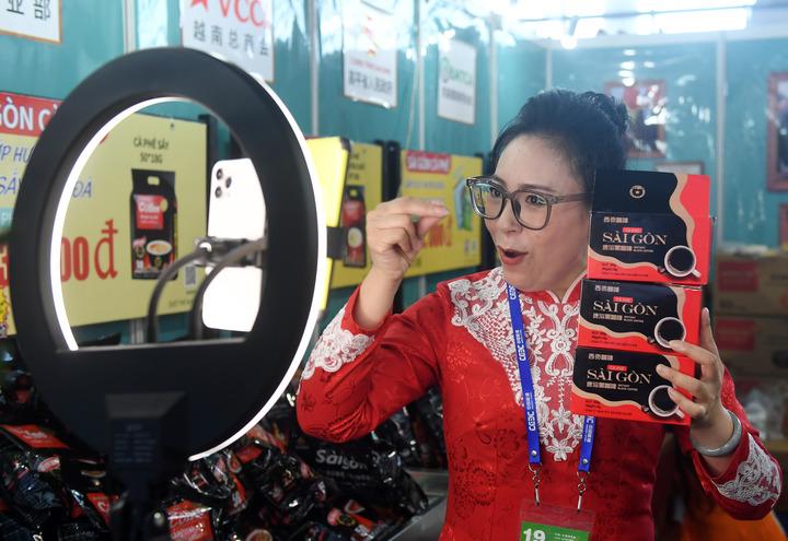 2022年9月19日,在東博會(huì)展覽現(xiàn)場(chǎng),一名參展工作人員在通過(guò)網(wǎng)絡(luò)推銷越南咖啡。新華社記者 陸波岸 攝