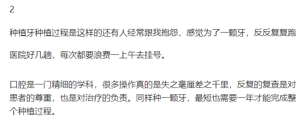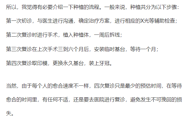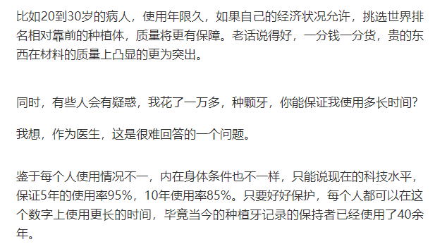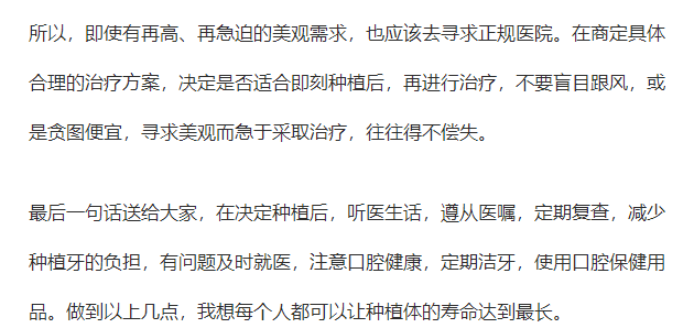 所以維持使用時間的建議就是日常潔牙,使用牙線等口腔保健用品;種植后1、3、6、12個月定期復診,保持口腔健康,不用種植牙去啃骨頭或拒絕過硬的物品,避免外力撞擊。