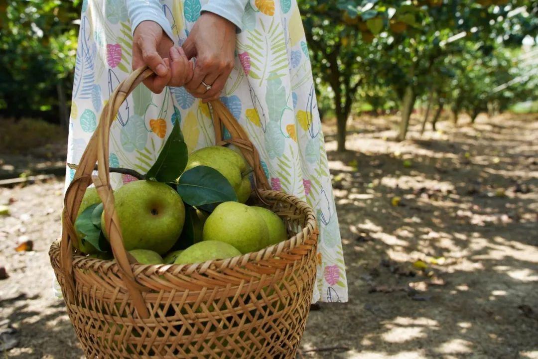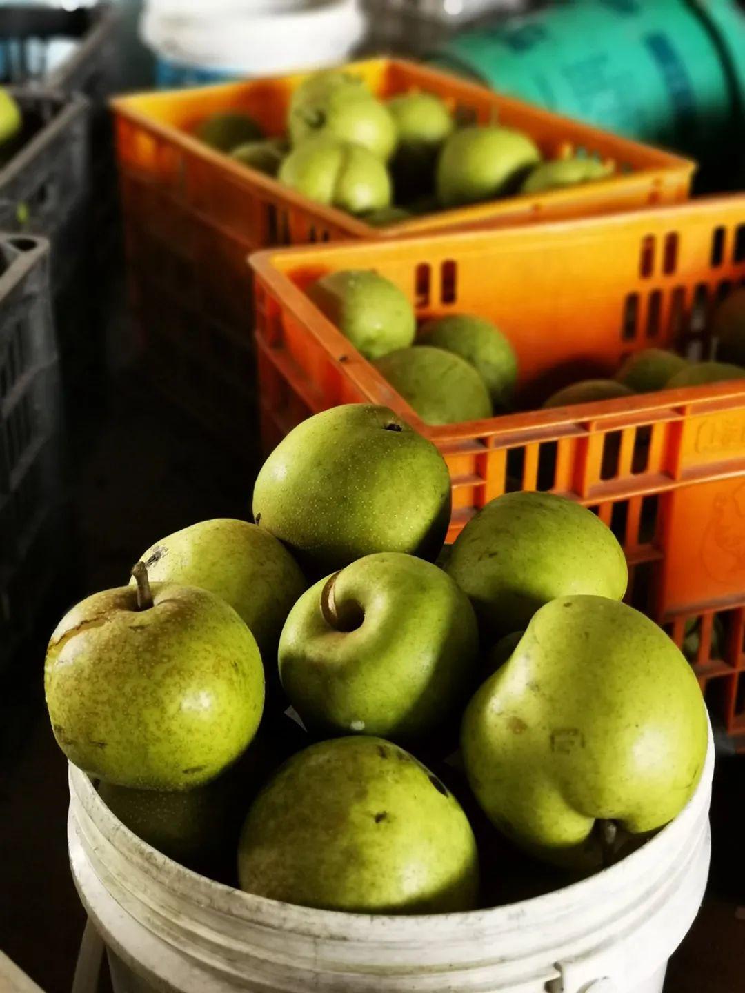 一過(guò)坐果期,果園堅(jiān)決不除草,野草其實(shí)能轉(zhuǎn)化天然氮肥,給成熟期的梨子帶來(lái)恰當(dāng)?shù)奶欠?,真正自然原生態(tài)!黃中帶綠的梨子們滿掛枝頭,壓得一人高的梨樹(shù)沉甸甸的,讓喜歡梨子的本地客人們帶娃采摘?jiǎng)蓬^十足。農(nóng)場(chǎng)內(nèi)公梨樹(shù)、母梨樹(shù)交替種植,這樣自然授粉結(jié)果更“和諧”。當(dāng)下,時(shí)間正值美味限定的成熟季,公梨和母梨?zhèn)兌奸L(zhǎng)大成熟了,它們?cè)诳诟猩喜o(wú)差別,公梨偏黃,母梨偏綠,一樣的水甜多汁。