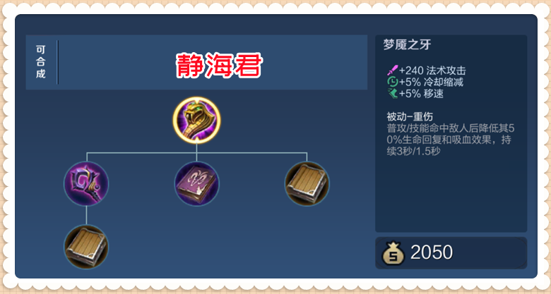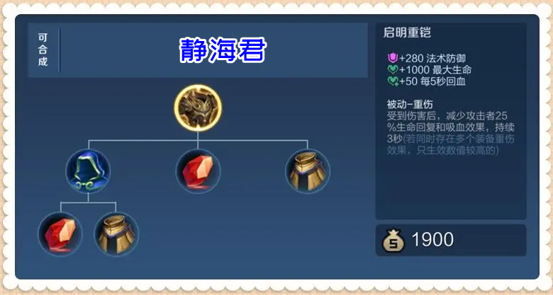 +280 法術(shù)防御+1000 大生命值+50 每5秒回血重傷:在受到傷害后,啟明重鎧的使用者可以減少攻擊者25%生命回復(fù)和吸血果,持續(xù)3秒(如果多件重傷裝備同時(shí)生,只生數(shù)值較高的那個(gè))。從基礎(chǔ)屬性可以看到,啟明重鎧是一件法術(shù)防御裝,它的法抗屬性比不死鳥之眼高,比魔女斗篷和永夜守護(hù)低。另外,雖然還有大生命值和回血果,但啟明重鎧并沒有其它的防御或者生存方面的提升,在這一點(diǎn)上,不管是魔女斗篷、永夜守護(hù)還是不死鳥之眼的果都比啟明重鎧好的多。