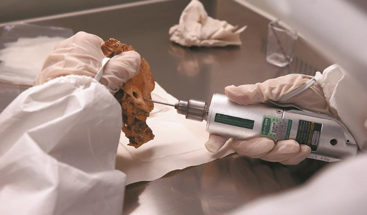 廈門大學(xué)人類學(xué)研究所研究生鉆取骨粉來提取古人DNA。