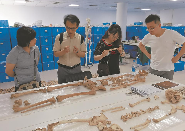王傳超(左二)與同行專家討論人骨上的古病理特征。