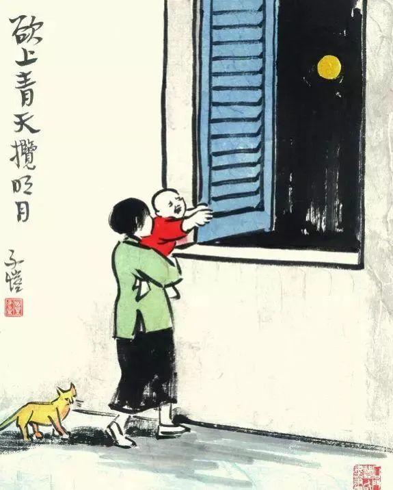 他畫吵著要月亮的孩子,是李白詩中的“欲上青天攬月”;