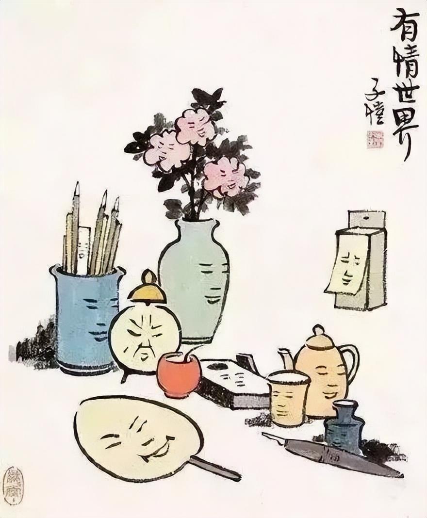 他還畫靜物,在他的筆下,花瓶、蒲扇、茶杯,都有著笑瞇瞇的臉。