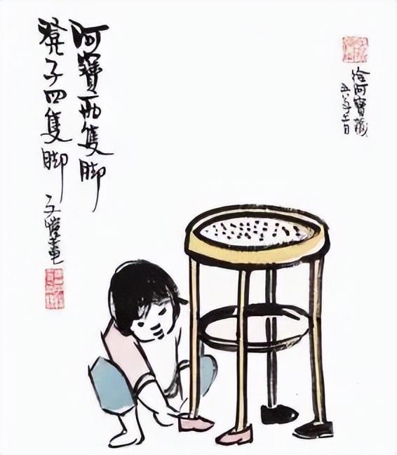 他畫女兒阿寶,把鞋子脫下來穿在凳子上,假裝“凳子有四只腳”;