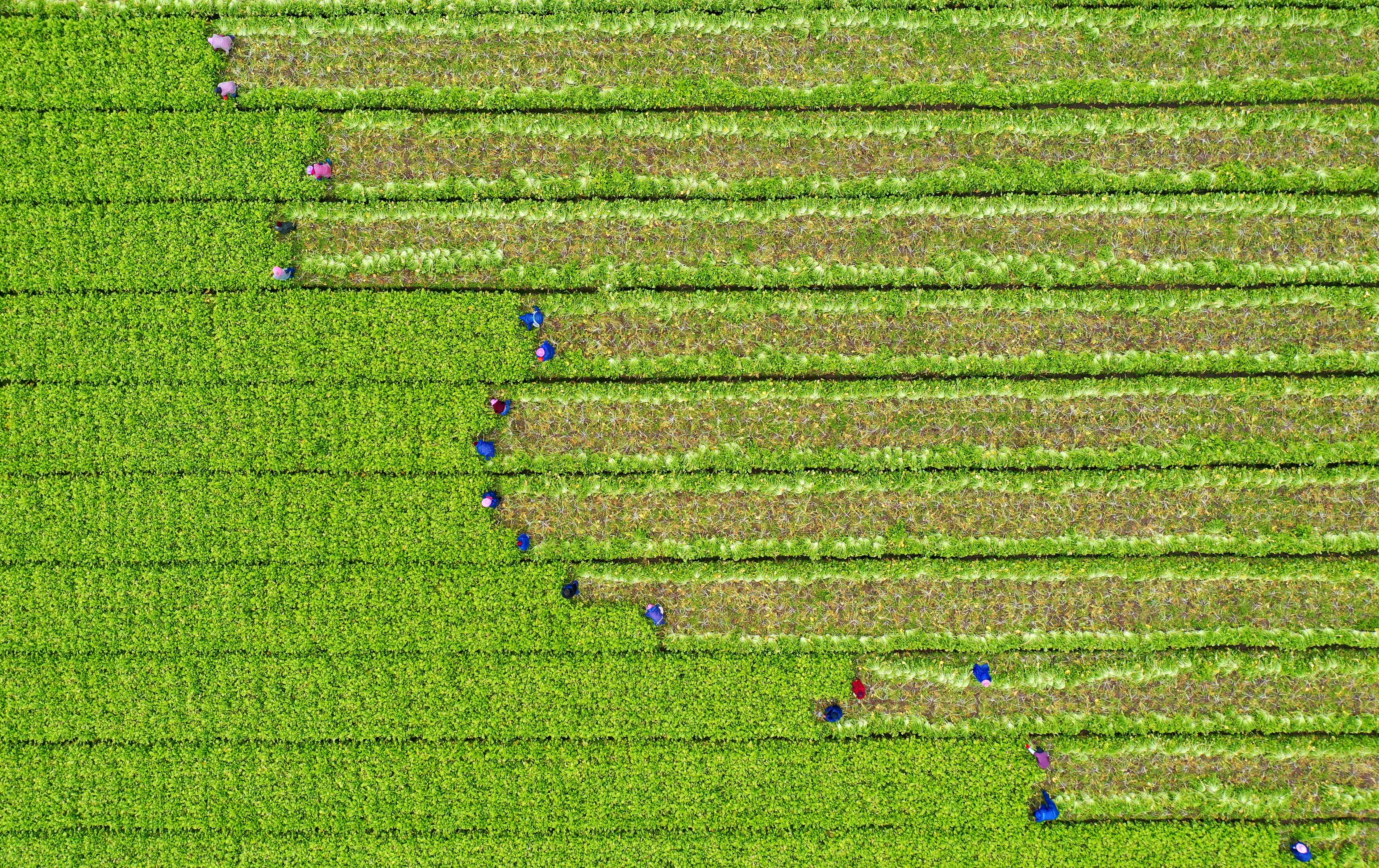 1月3日,在浙江省溫嶺市石橋頭鎮(zhèn)楊家浦村,種菜大戶組織農(nóng)民采收葉用芥菜(無人機(jī)照片)。 新華社發(fā)(劉振清 攝)