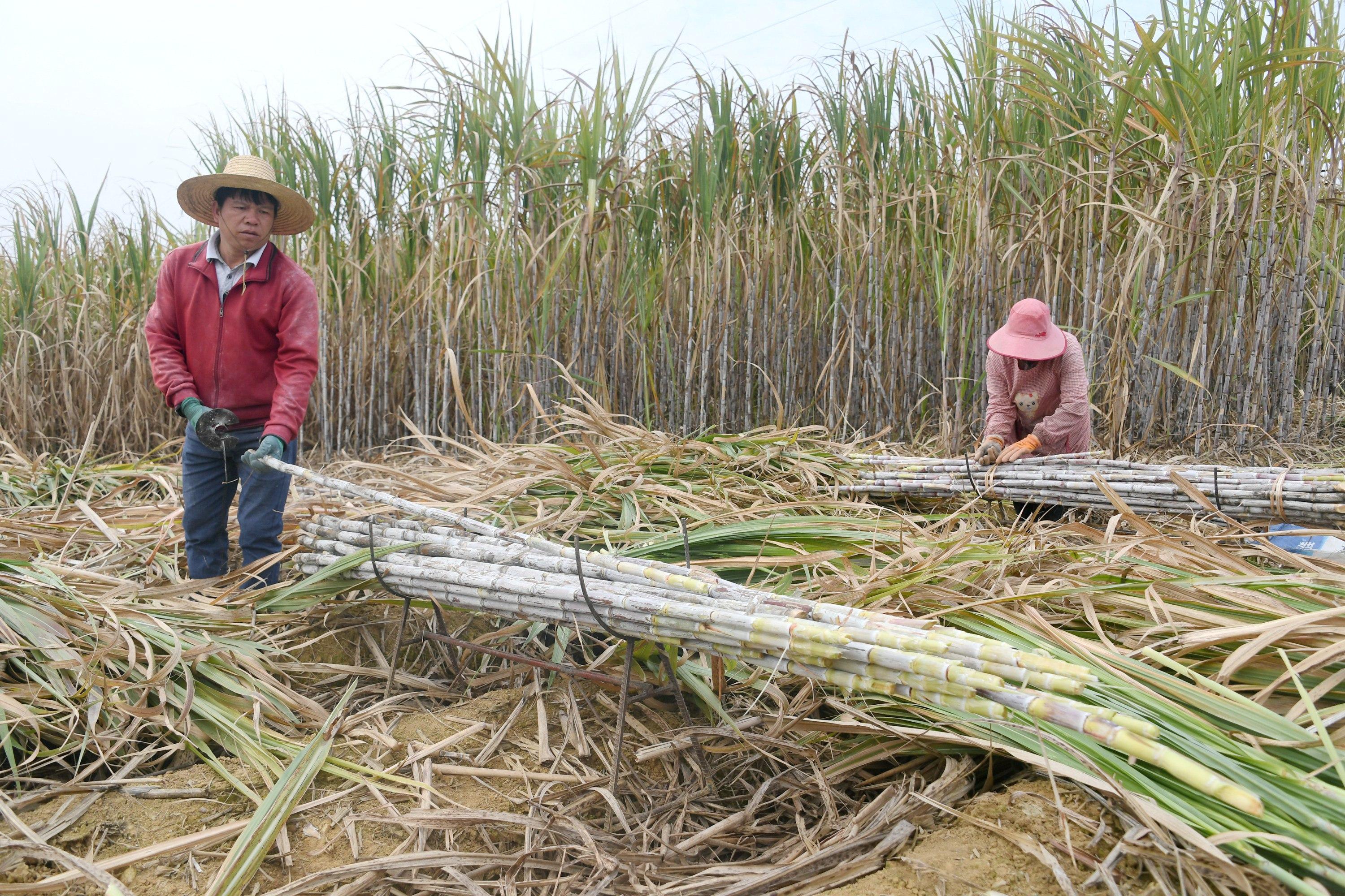 1月2日,在廣西河池市羅城仫佬族自治縣小長(zhǎng)安鎮(zhèn)守善村,農(nóng)民在甘蔗地里砍收甘蔗。 新華社發(fā)(廖光福 攝)