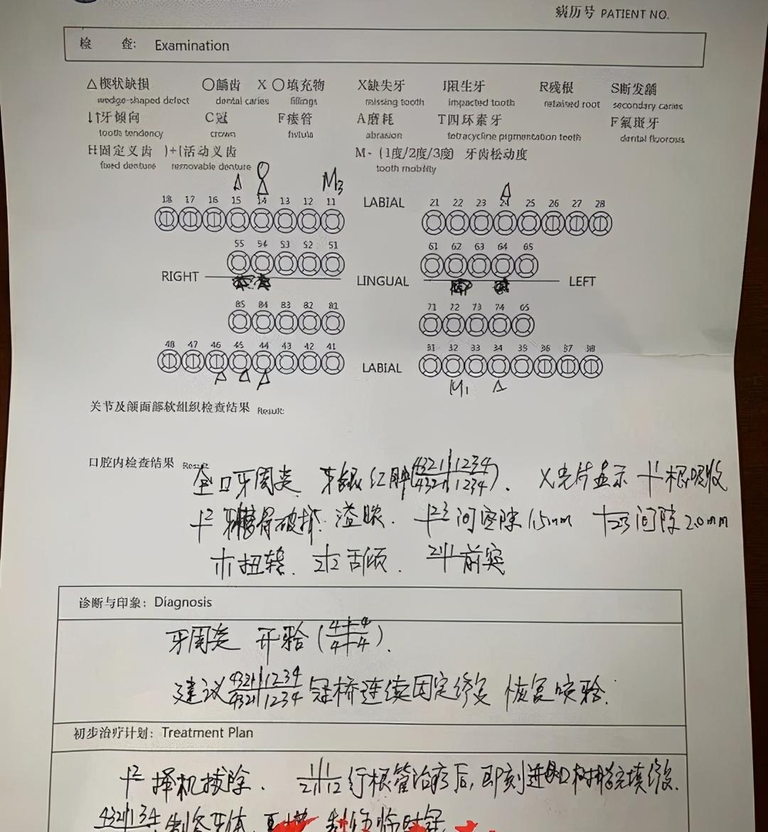 李大夫向新時報記者出具一份正反頁打印的口腔病歷。在口腔病例正面“就診內容”一欄里,“鑲牙、牙齒美容、牙齒松動”這三項被打了勾,患者簽名一欄也有靳先生的名字。病歷反面則有完整的檢查、診斷與初步調節(jié)計劃等內容,其中寫有“建議16顆牙齒冠橋連續(xù)固定修復、制備牙體、制作臨時冠”等字樣。“這份口腔病歷是當著他面填寫的,上面也有他自己的簽名,他不同意的話我們怎么可能做?”