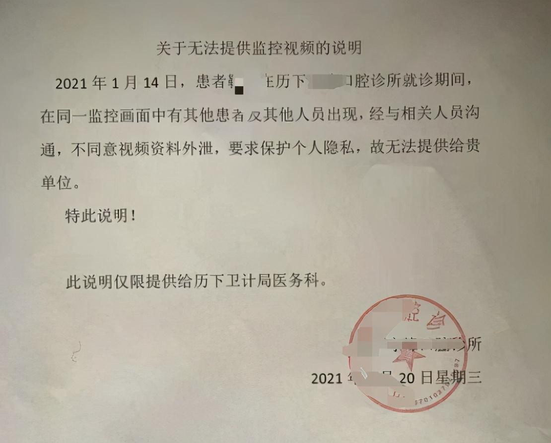 診療當天究竟發(fā)生了什么?新時報記者致電歷下區(qū)衛(wèi)計局醫(yī)政科了解情況。醫(yī)政科一位負責人表示,針對這起糾紛醫(yī)政科已經調解過兩次了,由于診所拒絕提供事發(fā)當天的監(jiān)控錄像,無法證實術前有沒有做好充分告知義務,因此調解未能成功。某口腔診所跟醫(yī)政科出具了一份《關于無法提供監(jiān)控視頻的說明》,上面寫道:“患者靳先生就診期間,在同一監(jiān)控畫面中有其他患者及他人人員出現(xiàn),經與相關人員溝通,不同意視頻資料外泄,要求保護個人隱私,故無法提供給貴單位?!苯壬鷦t認為,某口腔診所不敢拿出監(jiān)控視頻,是因為當時雙方啥也沒簽,監(jiān)控視頻能證明誰在撒謊。