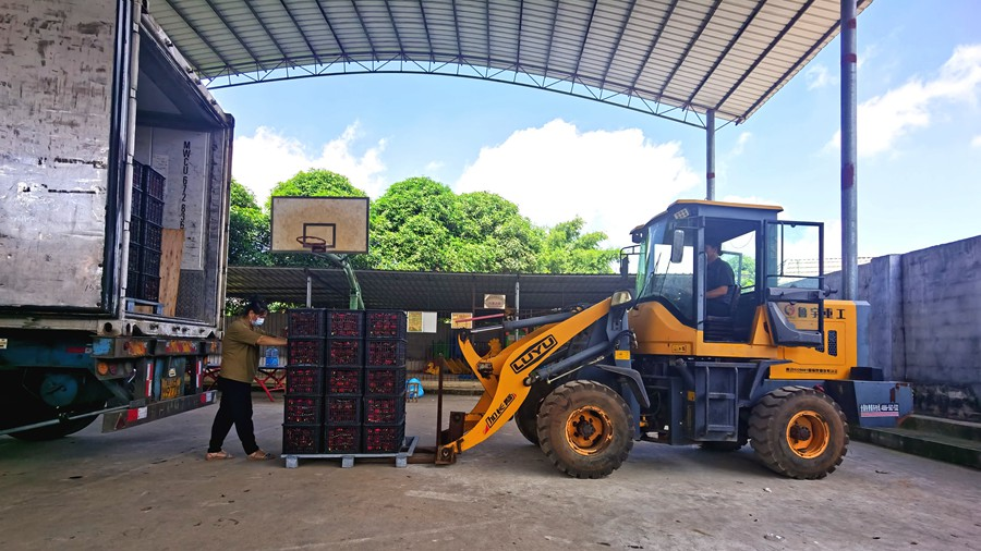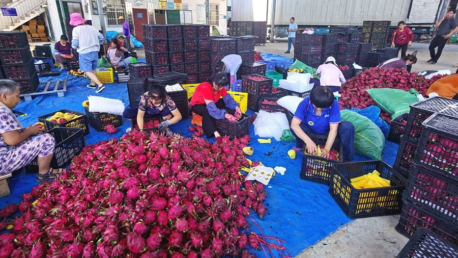 合作社負(fù)責(zé)人吳耿夫婦在裝運(yùn)火龍果。(方至萍 攝)