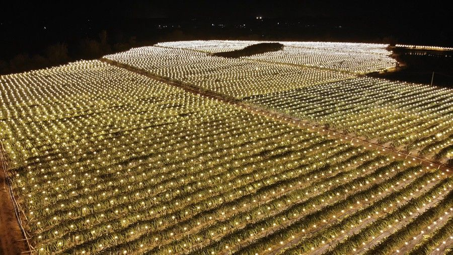 夜晚火龍果基地開燈補(bǔ)光。(張堰焜 攝)