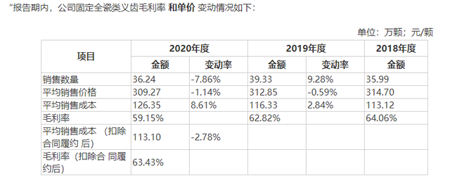 2018-2020年,固定全瓷義齒銷售均價分別為314.70元/顆、312.85元/顆和309.27元/顆,然而其單位成本分別為113.12元/顆、116.33元/顆和126.35元/顆。也就是說,一顆假牙的成本也不過百元,但是種植一顆牙至少花費上萬元。