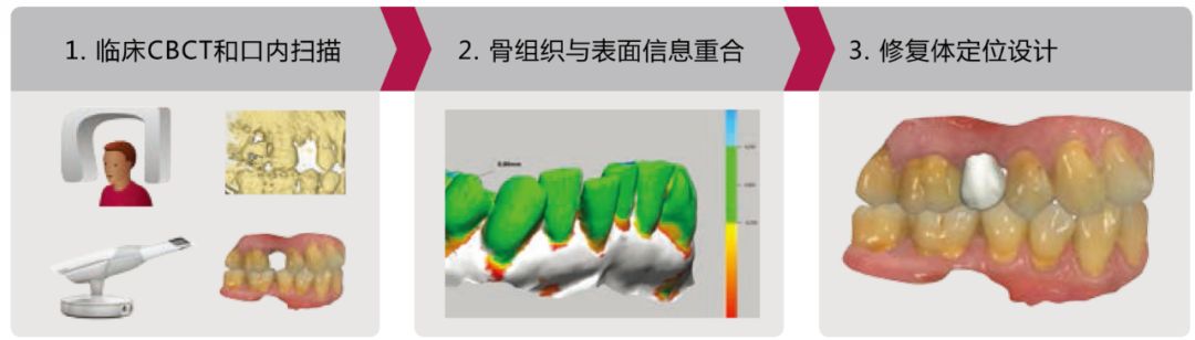 臨床CBCT和口內(nèi)掃描——骨組織與表面信息重合——修復(fù)體定位設(shè)計——以修復(fù)為導(dǎo)向的種植計劃——導(dǎo)板與上部修復(fù)同步完成——臨床種植手術(shù)后負重