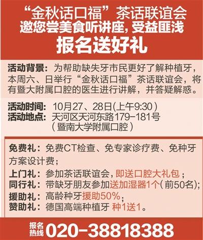 為了讓缺牙市民了解種植牙,早日恢復(fù)一口好牙,我們將于本周六、日(10月27日、28日上午9:30)舉辦“金秋話(huà)口?!辈柙?huà)聯(lián)誼會(huì),邀您一邊輕松品嘗美食的同時(shí),一邊聽(tīng)王遠(yuǎn)勤博士的口腔保健分享會(huì),通過(guò)熱線(xiàn)020-38818388成功預(yù)約種牙的市民,可享種牙援助50%,且免CT檢查費(fèi)、免名醫(yī)診療費(fèi)、免種牙方案設(shè)計(jì)費(fèi)。