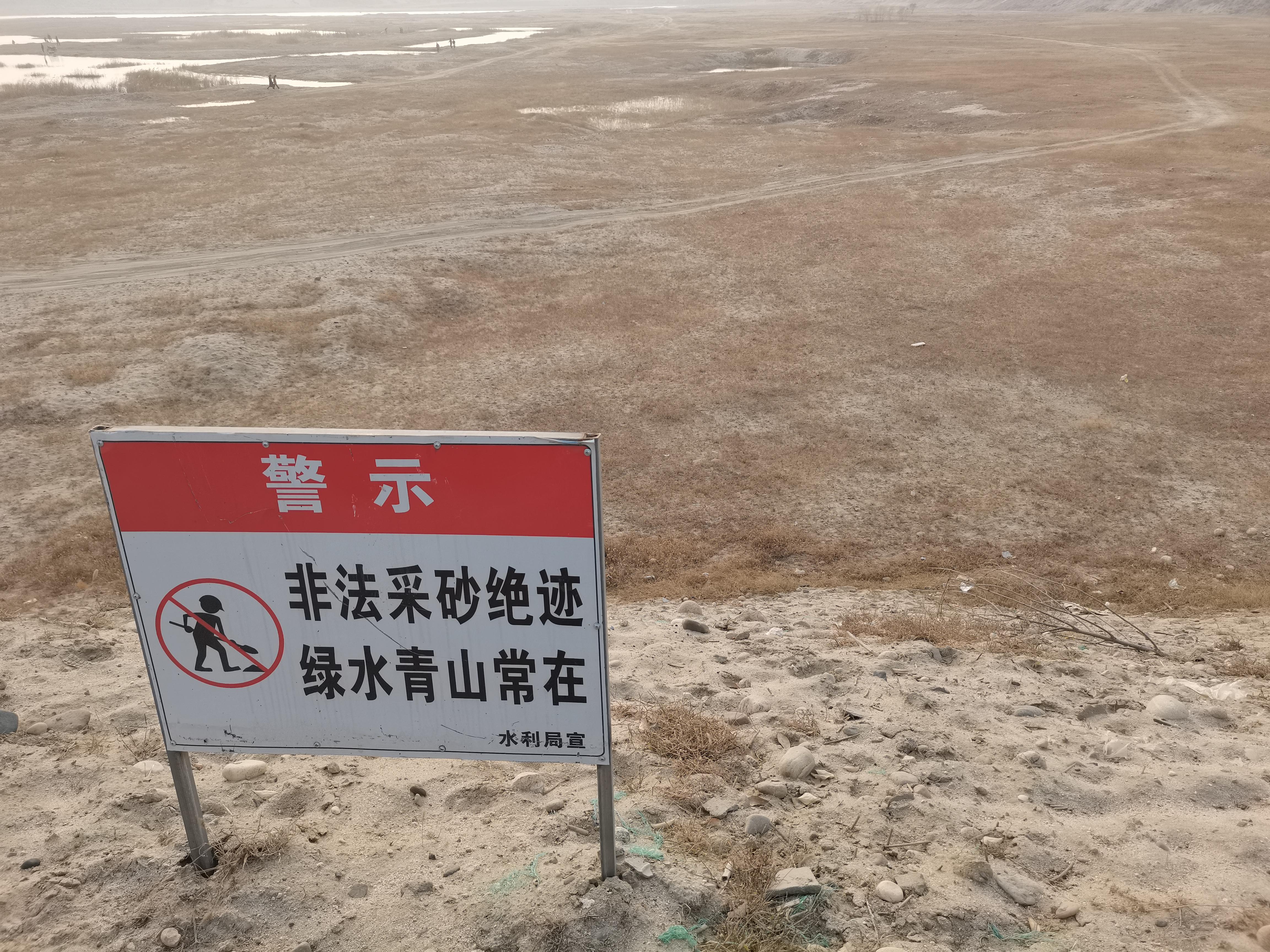 水利部門在砂坑旁樹起“非法采砂絕跡”的警示牌。新京報記者 李英強(qiáng) 攝