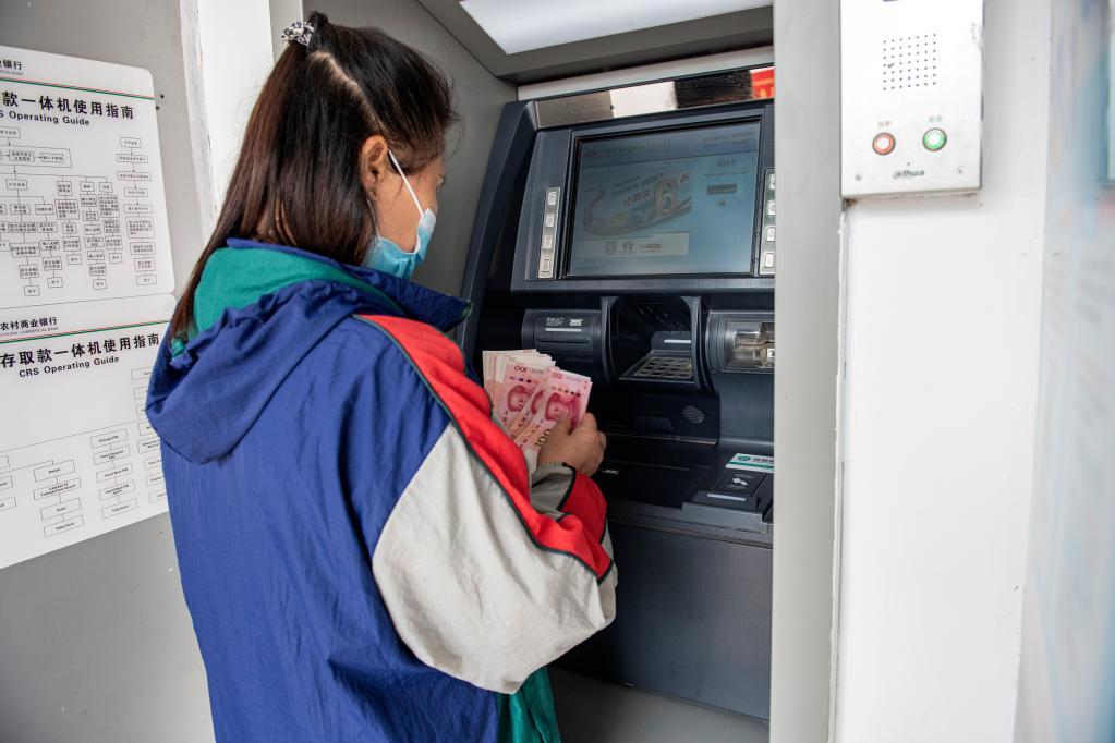 圖為廣西百色市田東縣平馬鎮(zhèn)四平村村民在村里的ATM機(jī)上辦理業(yè)務(wù)(2022年4月21日攝)。