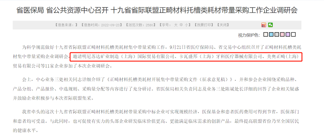 在《帶量采購公告》發(fā)布之前,陜西省曾開設(shè)帶量采購企業(yè)調(diào)研會(huì),當(dāng)時(shí)并沒有涉及隱形正畸耗材[5]。
