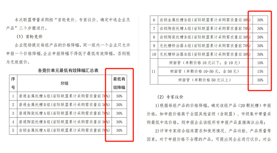 文件顯示,此次集采按照「首輪競價(jià)、專家議價(jià)、確定中選企業(yè)及產(chǎn)品」進(jìn)行。首輪競價(jià)中企業(yè)申報(bào)降幅不得低于低有降幅,除去頰面管這類議價(jià)產(chǎn)品,托槽、無托槽矯治器的報(bào)價(jià)將七折起步。