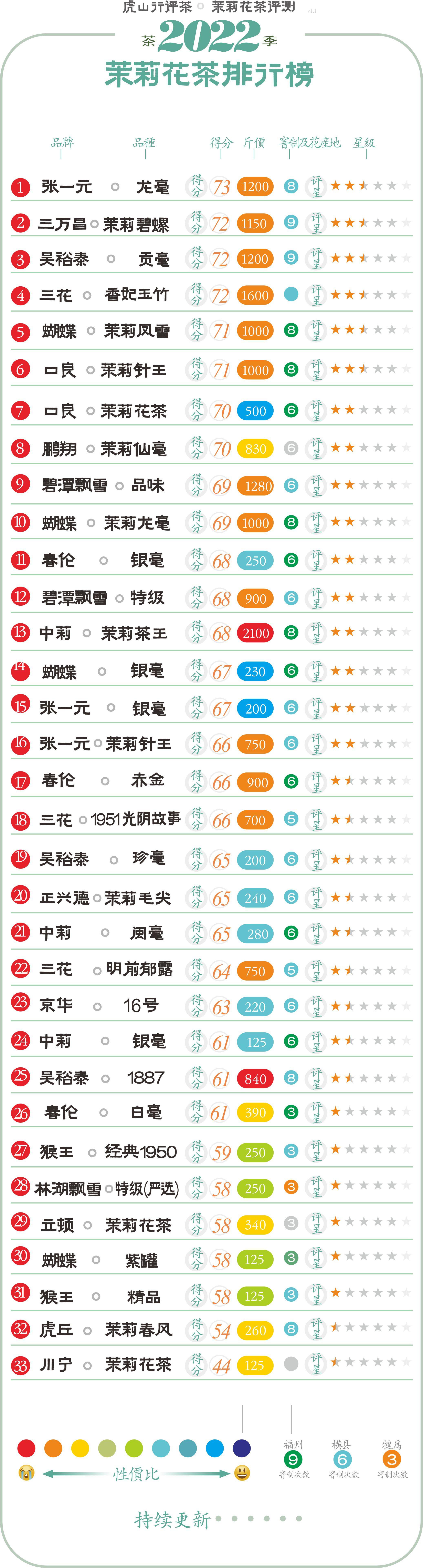 這款茶選用的是川茶,有利有弊,滋味強度是足夠的但同時導致澀底偏重,破壞了茉莉花茶甜潤風格,當然這也是仁者見仁智者見智。如果大杯泡能夠一定程度上揚長避短。以目前的價格看完全沒有什么性價比可言。相對于特級的入門款提升也有限。不如買藍袋入門款。