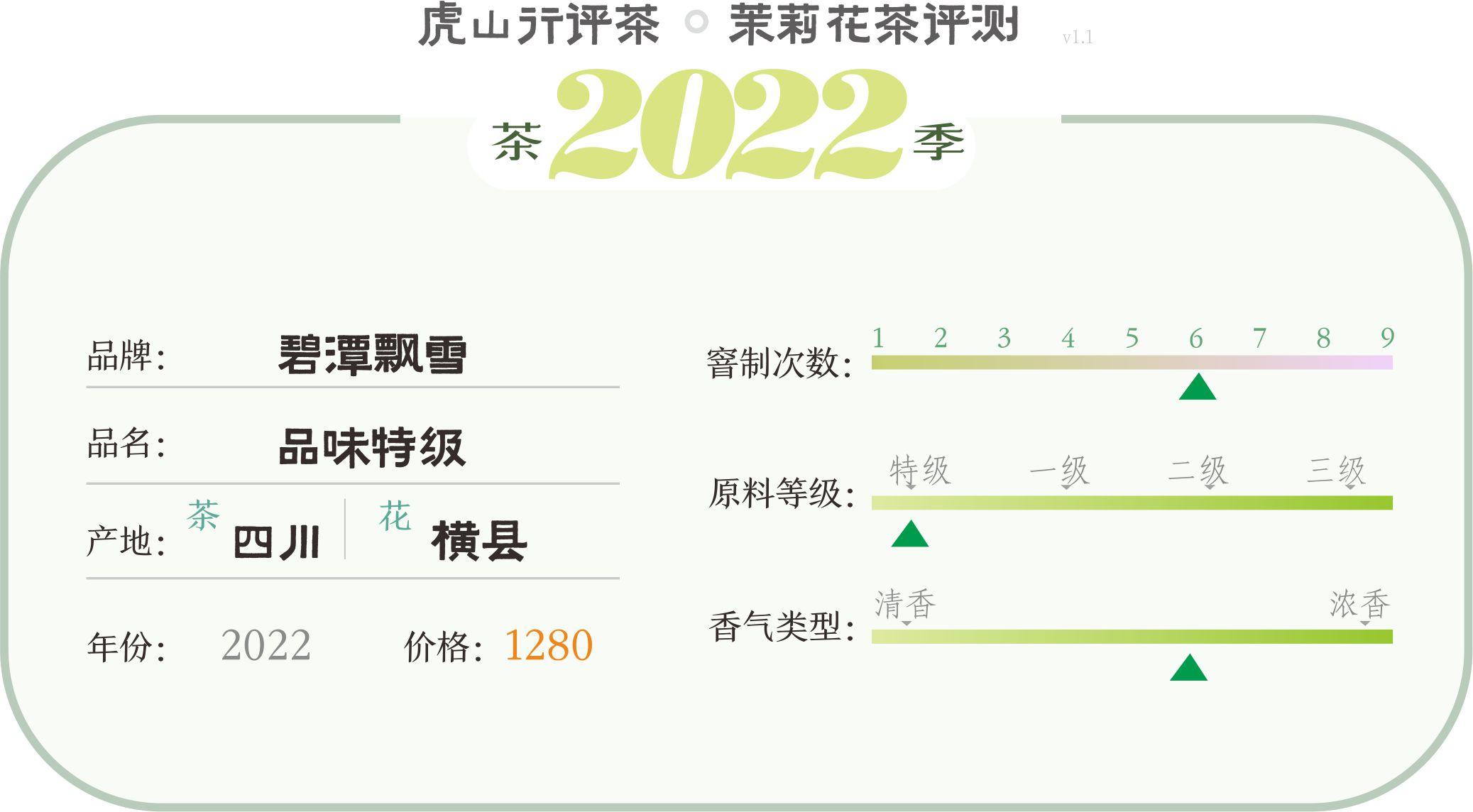 本次評測的為碧潭飄雪特級(品味)茉莉花茶,在碧潭飄雪屬于中檔,價格也不便宜,合斤價為1280元,在茉莉花茶的主銷區(qū)間屬于中高端價位。此款茶采用的是四川的峨眉山毛尖茶與橫縣產的茉莉花,窨制次數沒有明示(評測假定為六次以上),等級為特級。下面進入評測。