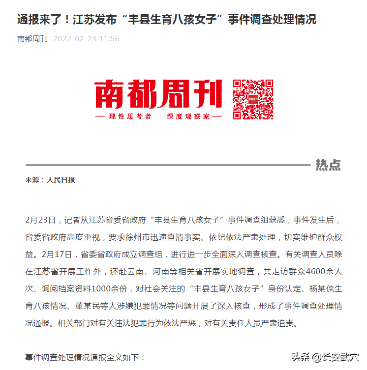 2月23日,江蘇發(fā)布《關于“豐縣生育八孩女子”事件調(diào)查處理情況的通報》。