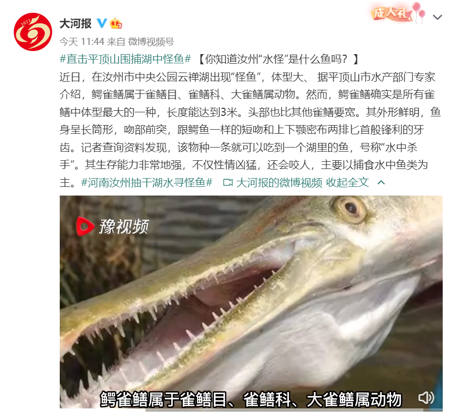 近日,河南省平頂山市汝州市抽干湖水圍捕“水中怪魚”引發(fā)關(guān)注