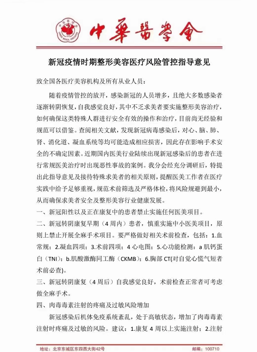 2023年1月1日,中華醫(yī)學會醫(yī)學美學與美容學分會發(fā)布《新冠疫情時期整形美容醫(yī)療風險管控指導(dǎo)意見》。指導(dǎo)意見提出,新冠陽性以及正在康復(fù)中的患者禁止實施任何醫(yī)美項目;新冠轉(zhuǎn)陰康復(fù)早期 (4周內(nèi))患者,慎重實施中小醫(yī)美項目,原則上禁止開展全麻手術(shù)項目,要嚴格做好相關(guān)術(shù)前檢查。