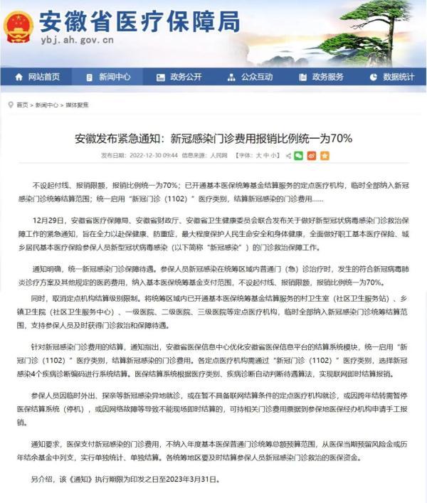 據(jù)安徽省醫(yī)療保障局消息,2022年12月29日,安徽省醫(yī)療保障局、安徽省財政廳、安徽省衛(wèi)生健康委員會聯(lián)合發(fā)布關于做好新型冠狀病毒感染門診救治保障工作的緊急通知,明確參保人員新冠感染在統(tǒng)籌區(qū)域內(nèi)普通門(急)診調(diào)節(jié)時,發(fā)生的符合新冠病毒肺炎診療方案及其他規(guī)定的醫(yī)藥費用,納入基本醫(yī)保統(tǒng)籌基金支付范圍,不設起付線、報銷限額,報銷比例統(tǒng)一為70%。