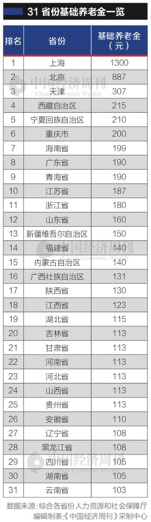 上海基礎(chǔ)養(yǎng)老金高達(dá)1300元,云南省低僅103元
