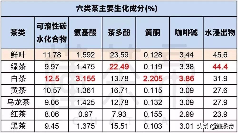 湖南農(nóng)業(yè)大學(xué)楊偉麗教授團(tuán)隊,曾采用相同地點、相同嫩度的鮮葉毛蟹春茶,以駐芽二葉、三葉為主的鮮葉為原料,分別按炒青綠茶、遠(yuǎn)安鹿苑(黃茶)、湖南黑茶、白牡丹(白茶)、鐵觀音和功夫紅茶加工方法加工成六大茶類,主要生化成分含量如下。