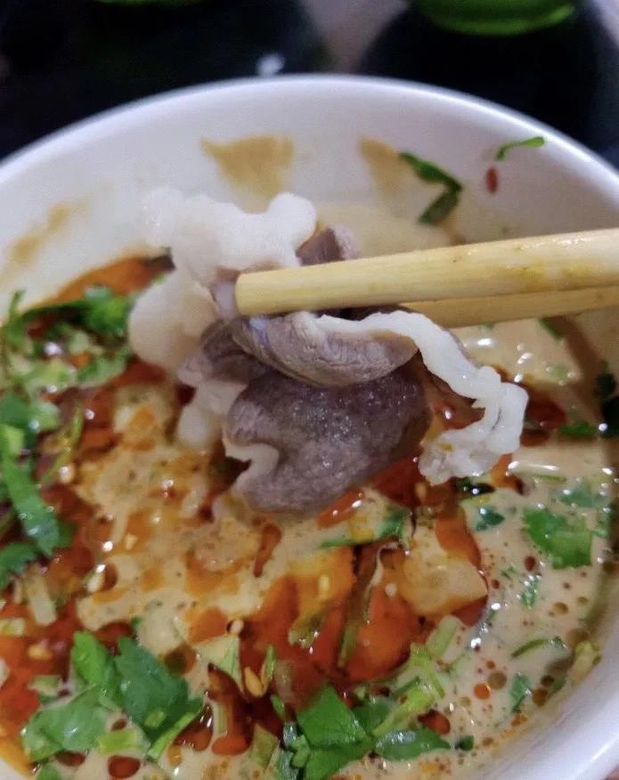 分量的話中規(guī)中矩,屬于厚切羊肉比較有質(zhì)感,大塊的肉吃起來有點塞牙,小塊的還挺嫩,麻醬里面還有蔥、香菜,十分符合大頭我的胃口!服務(wù)員會一直來加湯,氣氛挺好的~