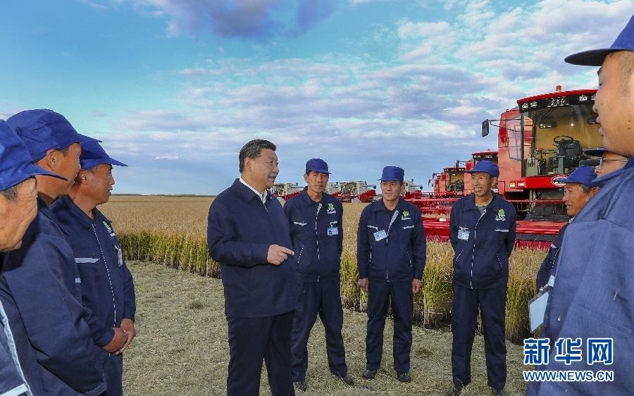 9月25日,在黑龍江農(nóng)墾建三江管理局七星農(nóng)場萬畝大地號(hào)與農(nóng)場工人們親切交談。 新華社記者 謝環(huán)馳 攝