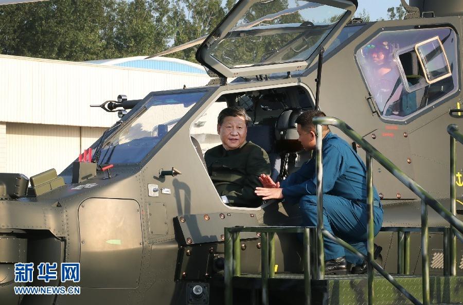 9月27日,在視察79集團(tuán)軍時(shí)登上直-10武裝直升機(jī),親自操控機(jī)載武器及觀瞄系統(tǒng),了解有關(guān)裝備情況。 新華社記者李剛攝