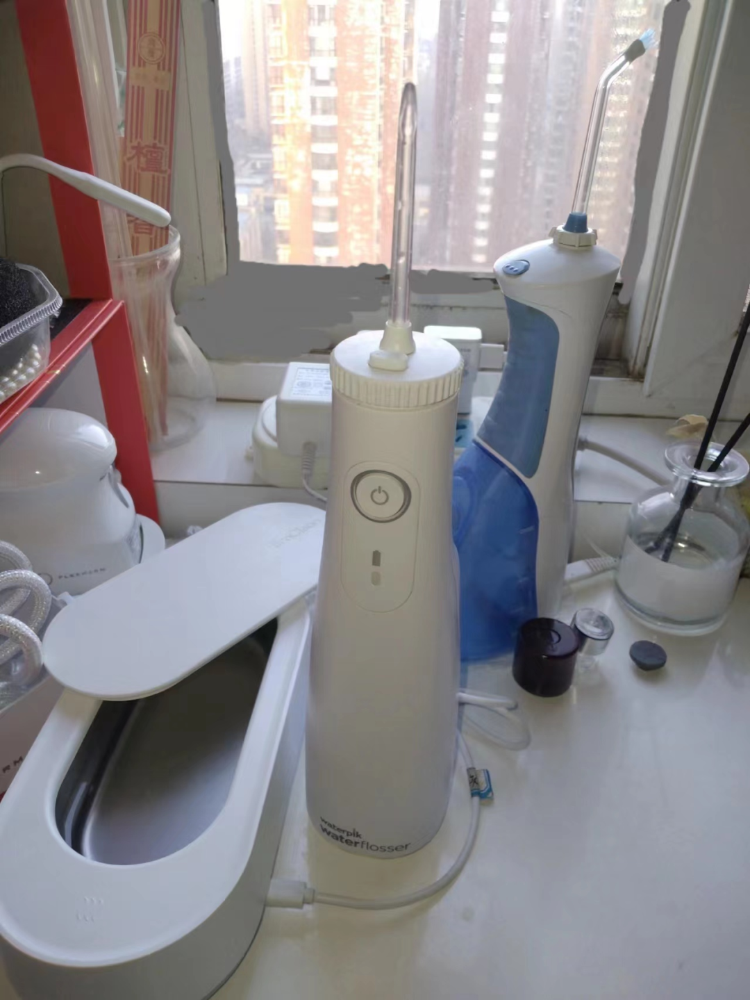超聲波清洗器(左)和新的水牙線(中) 新款的是水箱更干凈、磁吸充電,價(jià)格差不多