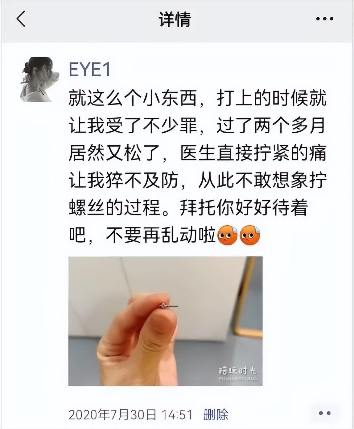 還有一些附屬小物,比如透明牙套只是固定形態(tài)的,為了移動(dòng)牙齒,還需要皮筋助力,牙套上本身有個(gè)小豁口可以套住皮筋的一端,另一端固定在哪里呢?這就需要牙釘了。開始我也是拒絕的,但后來才發(fā)現(xiàn)不安不行,如果想要整牙,先想想自己的承受力吧。下圖是我當(dāng)時(shí)發(fā)的朋友圈,不得不說,任何安裝進(jìn)來的東西都是需要適應(yīng)的,比如現(xiàn)在,我根本感覺不到牙釘?shù)拇嬖?,刷牙、吃東西等等,都沒啥問題,但在當(dāng)時(shí),還的確是受了罪的。
